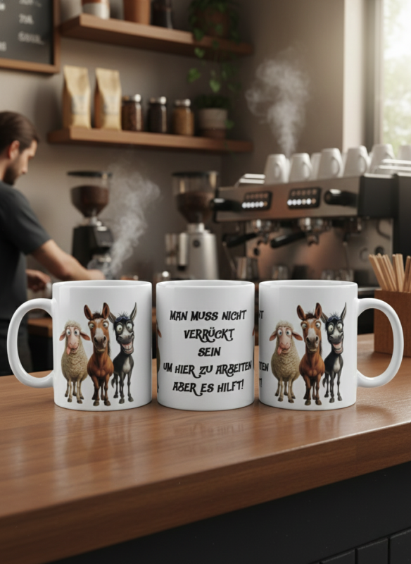 Ein Statement für jeden Schreibtisch Wir alle wissen: Ein bisschen Humor ist das beste Rezept gegen Stress. Unsere Motivtasse bringt genau das auf den Punkt. Das Trio aus einem schielenden Schaf, einem grinsenden Pferd und einem Esel mit Sonnenbrille spiegelt den ganz normalen "Wahnsinn" wider, den man im Berufsleben manchmal antrifft. Warum diese Tasse in keinem Büro fehlen darf: