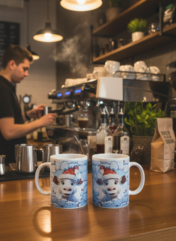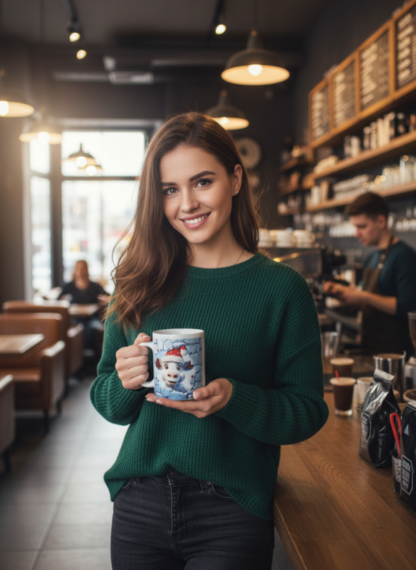 Ein tierischer Weihnachtsgrüß aus der Eiswelt Dieses liebevoll gestaltete Design kombiniert winterliche Kühle mit herzlicher Wärme. Das detailreiche Motiv zeigt ein niedliches, weißes Kälbchen mit großen Kulleraugen und einer klassischen roten Weihnachtsmütze, das neugierig durch eine "gebrochene" Eiswand schaut. Ob für den Kakao nach dem Winterspaziergang oder den Punsch am Abend – dieser Becher ist ein echter Blickfang in jeder Küche und auf jedem Schreibtisch. Produktdetails auf einen Blick: