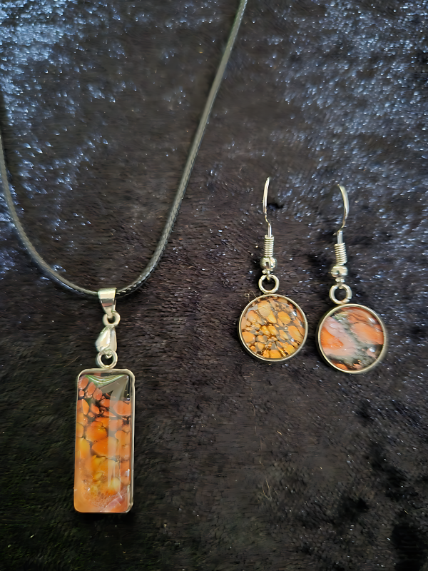 Entdecke dieses einzigartige Schmuckset, bestehend aus einer Halskette mit rechteckigem Anhänger und einem Paar passender Ohrringe. Jedes Stück wurde in liebevoller Handarbeit gefertigt und besticht durch ein faszinierendes Acryl Pouring Design in warmen Orange-, Schwarz- und Weißtönen. Die lebendige Marmorierung entsteht durch eine spezielle Gießtechnik und macht jedes Schmuckstück zu einem echten Unikat.