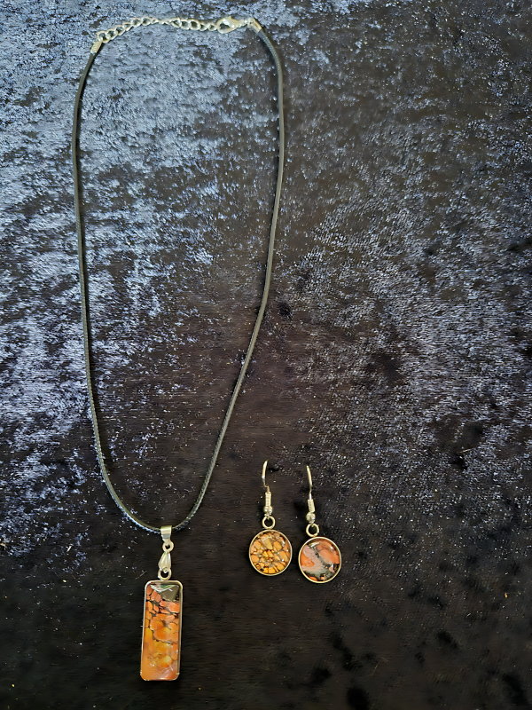 Verleihen Sie Ihrem Outfit einen Hauch von natürlicher Eleganz mit diesem handgefertigten Schmuck-Set. Der warme Farbton des Steins in leuchtendem Orange und dezenten Schwarzen-Adern erinnert an die faszinierenden Muster von Feuerstein und sorgt für einen stilvollen Blickfang. Set-Bestandteile: